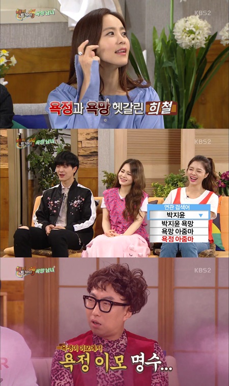 이어 박지윤은 욕정 아줌마라는 별명에 대해서는 "함께 출연한 김희철이 내게 '욕정아줌마'라고 했다. 알고보니 욕망과 욕정을 헷갈려서 그렇게 된 것이다"라며 "그 이후로 검색어에 욕정아줌마가 같이 뜬다"고 말해 웃음을 자아냈다.