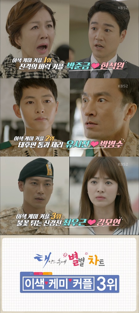 2위에는 유시진(송중기 분)과 박병수(김병철 분)가 이름을 올렸고, 1위에는 특별출연한 박준금과 한석원(태인호 분)이 꼽혀 모두를 당황케 했다.