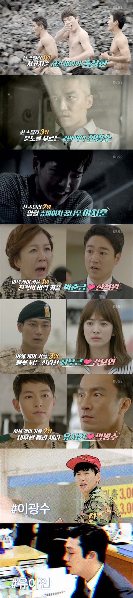 ‘태양의 후예 별별 차트’ 코너에서는 이색 커플이 공개됐다. 3위에는 최우근(박훈 분)♥강모연(송혜교 분) 커플이 이름을 올렸고, 유시진(송중기 분)♥박병수(김병철 분)가 2위, 1위에는 박준금♥한석원(태인호 분) 커플이 선정됐다. 최고의 꿀잼 반전 장면에는 유시진과 강모연의 술주정(3위), 한국에서 온 소포로 인해 궁지에 몰린 유시진과 서대영(진구 분)의 장면이 2위에 올랐다. 1위는 강모연의 휴대전화 녹음 고백이 공개되는 장면이었다. 신스틸러 부문에서는 3위 진영수(조재윤 분)를 시작으로 이치훈(온유 분), 송상현(이승준 분)이 이름을 올렸다.