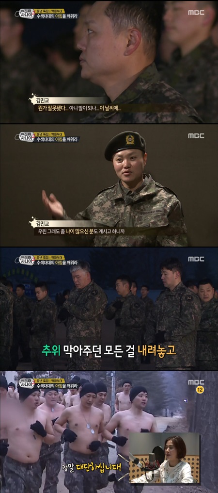 이날 아침 점호 시간에 멤버들은 상의 탈의 후 알통 뜀걸음을 하게 됐다. 가만히 있어도 입김이 나오는 날씨에 김민교는 "이건 뭔가 잘못됐다"면서 멘탈 붕괴에 빠진 모습을 보였다.