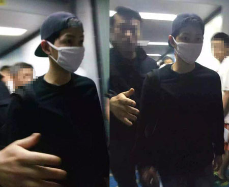 이날 공개된 사진 속 송중기는 블랙 티셔츠를 입고 모자와 마스크를 쓴 채 경호원들의 경호를 받으며 공항을 빠져 나오고 있다. 또한 입국 심사대에서는 마스크를 벗고 얼굴을 보여주고 있다. 또 다른 사진 속 송중기는 꾸미지 않은 편안한 차림으로 공항에서 만난 팬들 사이에서 살짝 미소를 짓고 있다.