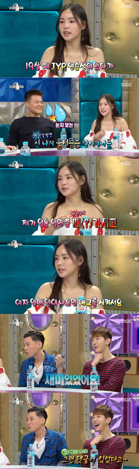 11일 오후 방송된 MBC 예능프로그램 '라디오스타'는 '누가 재밌을지 몰라서 내가 나왔다' 특집으로 꾸며져 박진영, 민효린, 지소울, 조권이 출연했다.