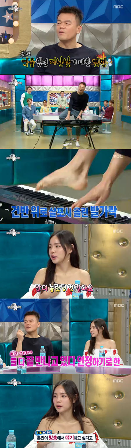 이어 박진영은 MC들의 요청에 무대 앞으로 나가 허니 노래에 맞춰 신발을 신고 발 연주를 선보였다. 하지만 이를 본 김구라는 "그런 게 어디있냐"라며 "신발 벗고 발가락으로 직접 연주해야죠"라고 요청했다. 이에 박진영은 망설이다 양말을 벗고 맨 발가락으로 피아노 연주를 해 웃음을 자아냈다.
