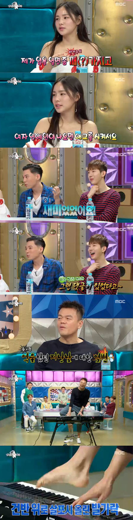 박진영은 MC들의 요청에 무대 앞으로 나가 허니 노래에 맞춰 신발을 신고 발 연주를 선보였다. 하지만 이를 본 김구라는 "그런 게 어디있냐"라며 "신발 벗고 발가락으로 직접 연주해야죠"라고 요청했다. 이에 박진영은 망설이다 양말을 벗고 맨 발가락으로 피아노 연주를 해 웃음을 자아냈다.