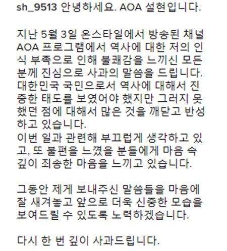 설현은 12일 자신의 인스타그램에 “지난 3일 ‘온스타일’에서 방송된 ‘채널AOA’ 프로그램 중 역사에 대한 인식 부족으로 인해 불쾌감을 느끼신 모든 분들게 진심으로 사과의 말씀을 드립니다”라는 글을 올렸다.