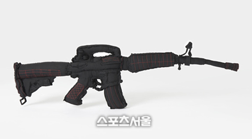 아이러니하게도 부드러운 소재의 패브릭은 휘어진 총구나 포근한 촉감을 연출하며 무기의 공격성과 파괴력을 상쇄시킨다.