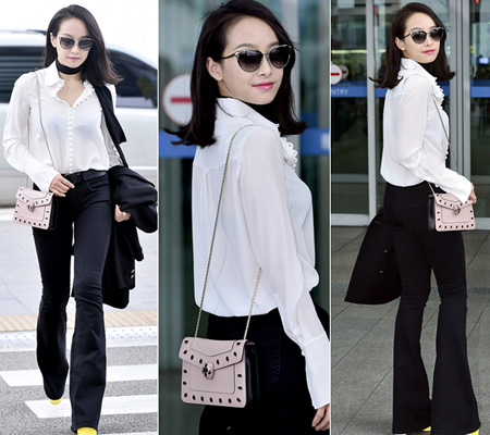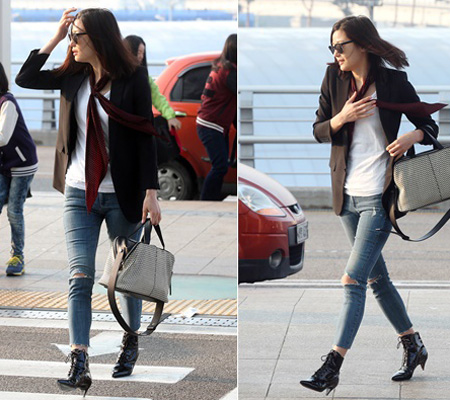 배우 전지현은 지난 3월 27일 중국 상해 진안 캐리센터에서 열리는 루즈 앤 라운지 행사를 방문하기 위해 공항을 찾았다. 이날 전지현은 블랙 재킷에 찢어진 청바지로 스타일링 했으며 넥타이 모양의 스카프를 매치. 블랙 앤 화이트의 독특한 원형 패턴 모양의 빅백을 착용했다.