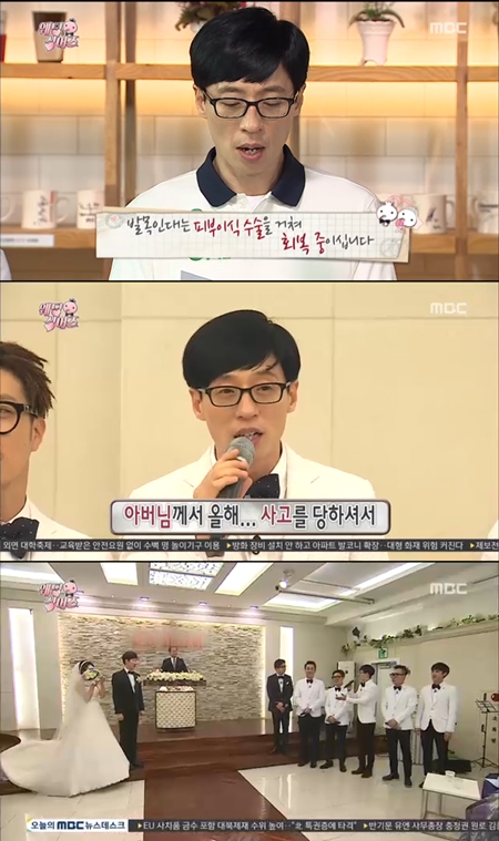 결혼식 당일 유재석은 배우 김희애와 함께 축가를 했다. 두은 들국화의 '매일 그대와'부터 여자친구의 '오늘부터 우리는'까지 스펙터클한 축가로 감동과 웃음을 동시에 선사했다. 특히 이적을 대신해 '프로불참러' 조세호가 참석해 좌중을 폭소케 했다.