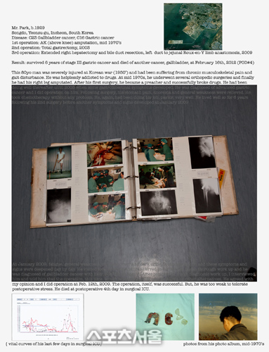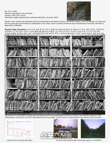 이는 환자 개인 사진과 임상 차트, 중환자실 간호일지, 생애 마지막 생체징후곡선 등을 포함한 의학 다큐멘트와 수술 후 환자의 생존 사망 때까지 과정을 아카이브의 형식으로 구성하여 보여 준다.