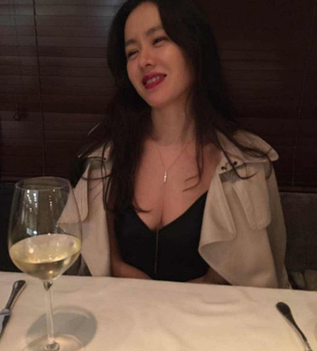 공개된 사진 속 손예진은 레스토랑에서 와인 잔이 놓인 테이블을 앞에 두고 취한 듯 어딘가를 향해 미소를 짓고 있다.