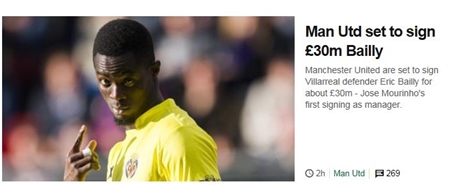 베일리가 맨체스터 유나이티드와 계약을 체결하면 그는 무리뉴 감독의 부임 후 첫 번째 영입 선수가 될 전망이다.