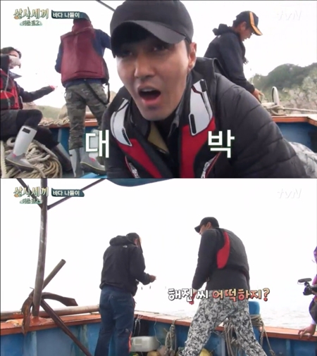 연달아 3마리를 잡아 올린 차승원은 "해진 씨 어떡하냐"며 유해진을 걱정하는 모습으로 웃음을 자아냈다. 앞서 유해진은 물고기 잡는데 번번히 실패하며 '아버지'로서의 자존심을 구긴 상태. 불난 집에 부채질 격으로 가정에서 음식 만드는 데만 집중하던 차승원이 연달아 물고기 잡이에 성공한 뒤 만선으로 집에 복귀하자 유해진은 고개를 떨구며 웃픈 상황을 연출했다.