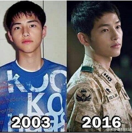 공개된 사진 속에는 고등학교 3학년 재학 당시로 알려진 송중기의 모습이 담겨있다. 이와 함께 드라마 '태양의 후예' 속 유시진 역으로 출연한 송중기의 모습이 비교되어 있다.