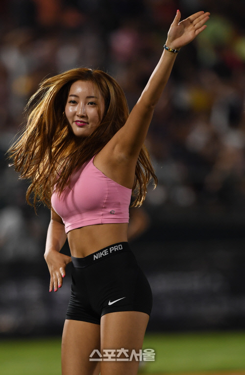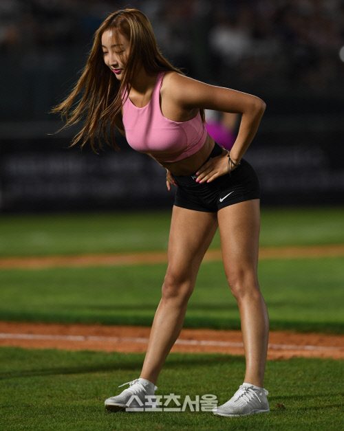 [스포츠서울 양민희기자] 부산 지역 피트니스 트레이너가 6일 사직 구장에서 진행된 두산 베어스와의 경기에서 클리닝 타임을 이용해 가벼운 몸풀기 운동을 위한 군무 공연을 펼치고 있다.