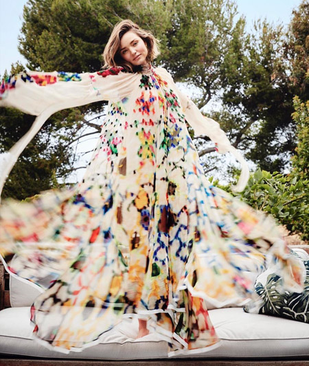 공개된 화보 속 미란다 커는 집 앞 풀장, 정원, 거실 등에서 포즈를 취하며 촬영에 임하고 있다. 미란다 커는 의상 사이로 늘씬한 몸매를 과시하며 톱 모델 다운 프로페셔널한 모습을 연출했다.