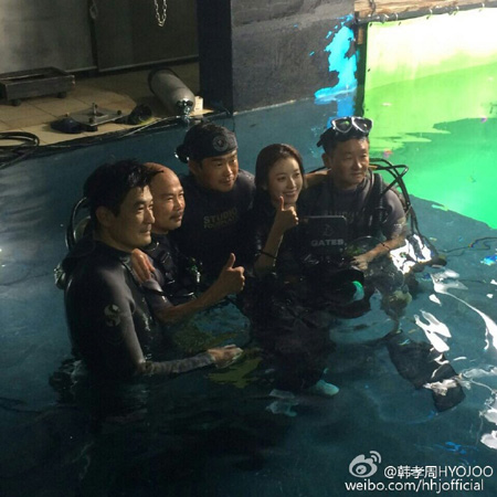한효주는 29일 오후 자신의 웨이보에 "어렵지만 즐거웠던 수중 촬영! 나오는 건 짧았지만 하루 종일 촬영했어요. 이날 함께 고생해주신 많은 스태프 분들께 감사의 인사를~!"이라는 글과 함께 사진을 올렸다.