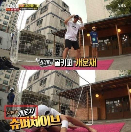 이날 개리, 송지효, 지석진, 김종국 팀은 지압판 위에서 골키퍼를 하면서 골을 막아야 하는 미션을 수행했다.