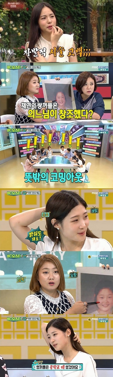 걸그룹 다이아의 정채연 역시 방송을 통해 코 성형 사실을 밝혔다. 그는 MBC 에브리원 예능프로그램 '비디오스타'에 게스트로 출연해 자신의 과거 사진을 보면서 얘기하던 중 MC들이 "쌍꺼풀은 수술한 거냐"고 묻자 정채연은 "저 코했는데 눈은 진짜 안했다"라고 태연하게 고백해 4명의 MC들을 놀라게 했다. 이후 정채연은 "밝혀도 돼요?"라고 뒤늦게 물어봐 웃음을 자아냈다.