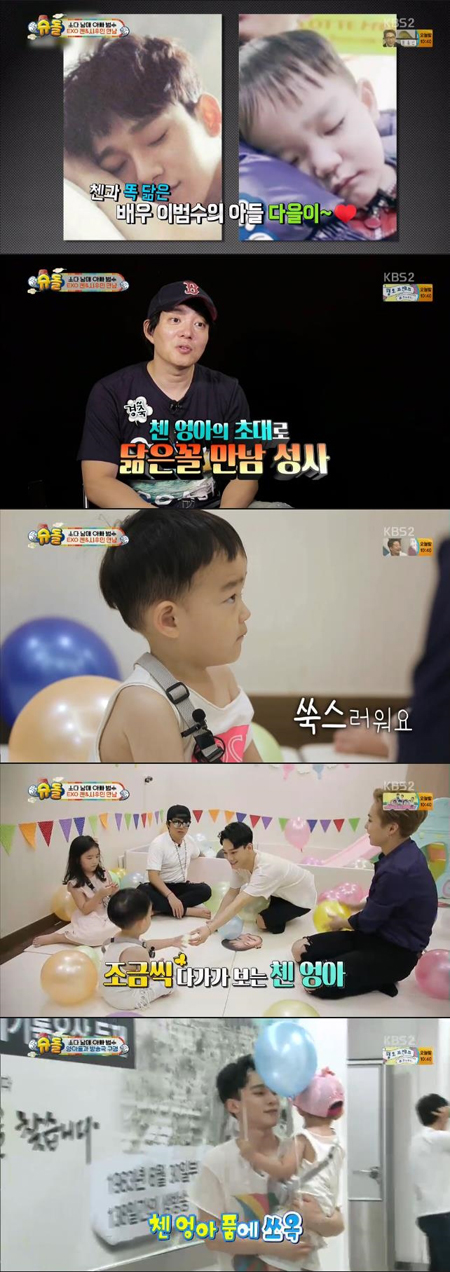 18일 방송된 KBS2 '해피선데이-슈퍼맨이 돌아왔다'(이하 '슈돌')에서는 이범수네 소다 남매와 함께하는 엑소 시우민과 첸의 모습이 그려졌다.