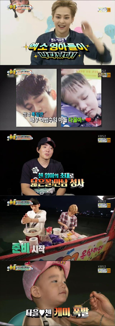 18일 방송된 KBS2 '해피선데이-슈퍼맨이 돌아왔다'(이하 '슈돌')에서는 소다남매와 함께하는 엑소 첸과 시우민의 모습이 그려졌다.