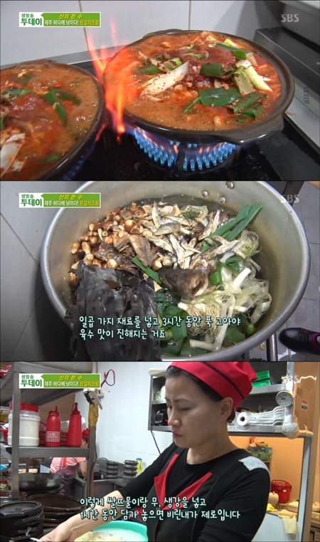 식당 사장은 "일곱 가지 재료를 넣고 3시간 동안 푹 고아야 육수 맛이 진해진다. 표고버섯이 들어가야 양념장의 감칠맛이 난다"고 밝혔다.