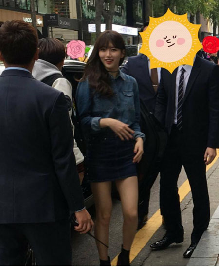 공개된 사진 속 수지는 청남방에 짧은 청치마를 입고 청순한 비주얼을 뽐냈다. 특히 수지는 팬이 찍은 직찍임에도 감출 수 없는 미모와 8등신 비율이 보는 이들의 시선을 사로잡았다.