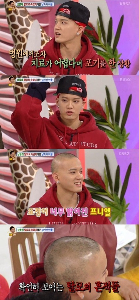 지난 14일 방송된 KBS2 '안녕하세요'에서 프니엘은 "거의 5년 동안 탈모가 진행됐다. 헤어 스타일리스트 누나가 '머리에 구멍났다' 할 정도였는데 점점 더 심해졌다. 일주일에 '땜빵'이 하나씩 생겼다"라고 전했다.
