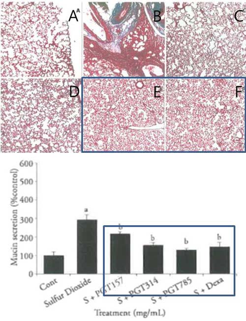 이산화황에 노출된 그룹은 점액단백질과 기관 내 뮤신이 과다하게 분비됐는데, PGT를 투여하자 증상이 완화됐다. 또한 PGT를 많이 투여한 집단일수록 완화 폭이 크게 나타났다. 이는 덱사메타손(스테로이드제제)을 투여한 쥐 그룹과 유사한 수치이다.