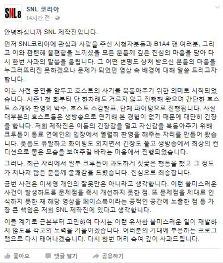'SNL코리아8' 측은 지난 28일 밤 공식 페이스북을 통해 일련의 사태에 대해 사과문을 게재했다.