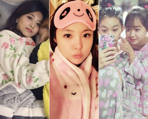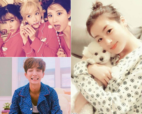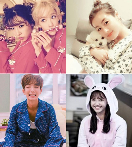 사진 속에는 포근해 보이는 흰색 꽃무늬 잠옷을 입은 걸그룹 트와이스 멤버 쯔위의 모습이 담겼다. 핑크색 수면 잠옷을 입은 걸그룹 아이오아이 멤버 최유정과 김도연 또한 가장 편안한 복장이지만 빼어난 미모를 뽐냈다. 트로트 가수 홍진영은 토끼가 그려진 귀여운 홈웨어 위 수면 안대로 포인트를 주었다.