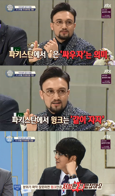 이날 파키스탄 출신 자히드 후세인이 "파키스탄에서는 '엄지 척' 포즈가 싸우자는 뜻이다"라고 설명했다. 이어 그는 "또한 파키스탄에서는 윙크를 하면 같이 자자라는 뜻이다"라고 말해 놀라움을 자아냈다.