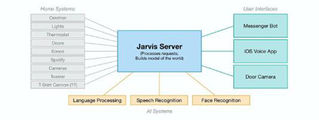저커버그가 구축한 자비스는 그의 휴대전화를 통해 명령이 가능하다. 예를 들어 "침실", "조명", "켜다" 의 명령어를 통해 조작이 가능하다.