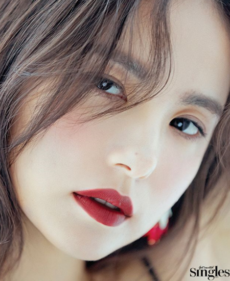 특히 새하얀 무결점 피부에 채도가 낮은 레드 컬러 립 메이크업으로 시선을 사로잡았다.