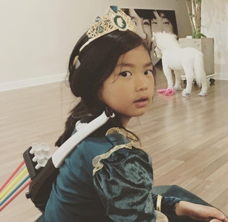 공개된 사진 속에는 드레스를 입고 있는 하루의 모습이 담겨있다. 머리에 왕관을 쓴 하루는 드레스 위에 장난감 활을 매고 천진난만한 표정을 짓고 있다.