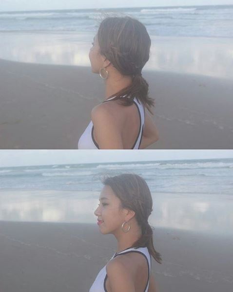 공개된 사진 속 채영은 해변에서 흰색 민소매 상의를 입고 측면을 바라본 채 포즈를 취하고 있다.