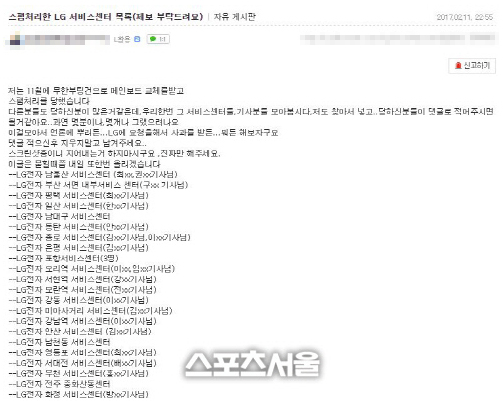 [스포츠서울 이상훈기자] LG전자의 프리미엄 스마트폰 G6 공개가 보름이 채 안 남은 상황에서 LG전자 모바일 서비스센터 기사들이 소비자 전화기의 스팸 문자 등록을 소비자 동의 없이 ‘조작’한 것으로 확인돼 논란이 일고 있다. 현재 관련 인터넷 카페 한 곳에서만 피해 확인된 이가 수십여 명에 이를 정도다.