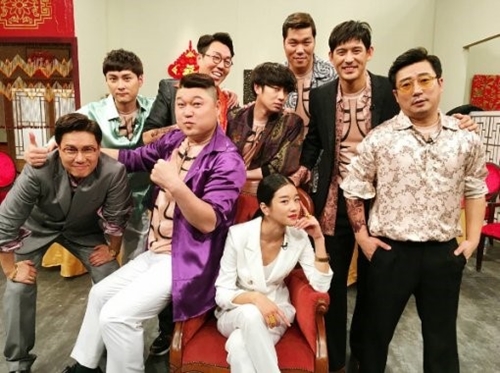 사진에는 중식당을 연상시키는 촬영장을 배경으로 강호동, 서장훈, 김영철, 이수근, 김희철, 민경훈, 이상민과 게스트로 출연한 오지호, 서예지가 약간은 촌스러운 패션을 차려입은 모습이 담겼다.