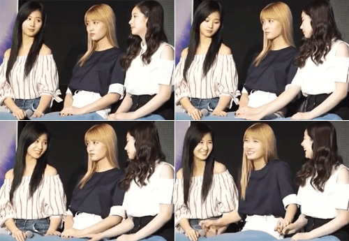 사나와 다현 사이에 앉은 모모. 사나는 눈치를 보며 모모의 허벅지를 만졌고, 이를 지켜본 다현도 장난에 합류했다.