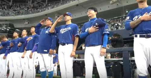 그러나 이날 대표팀 주력 타자인 김태균(35)은 경기에 앞서 애국가가 나올 때 유니폼 모자를 벗지 않고 거수경례를 했다. 바로 옆에 있던 이대은(28)도 같이 거수경례를 했지만, 현재 경찰야구단 소속인 이대은은 거수경례가 올바른 인사법이다.