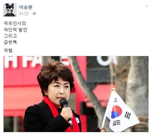 이승환은 9일 자신의 페이스북을 통해 '목숨' 발언을 해명한 정미홍의 기사를 링크 걸어 "극우인사의 극단적 발언, 그리고 급번복. 극혐"이라고 글을 남겼다.