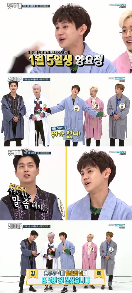[스포츠서울 서장원기자] '주간아이돌' 하이라이트 윤두준이 양요섭에게 5만원을 선물했다.
