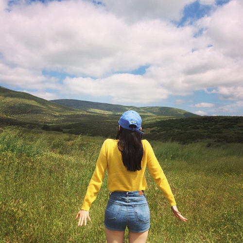 공개된 사진 속 강민경은 노란색 맨투맨 티와 청 스커트로 우월한 각선미를 과시했다.