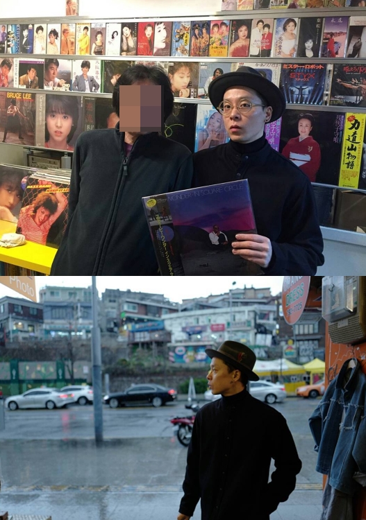 LP판 전문점으로 보이는 곳에서 나얼은 매장 사장님과 나란히 서서 카메라를 응시하고 있다.