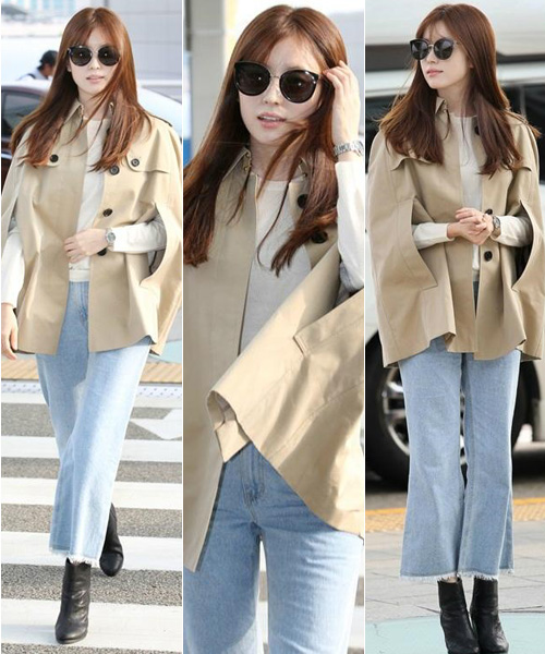 ♣트렌치 케이프와 하얀색 스웨터, 연한 색상의 청바지로 스타일링한 한효주는 편안하면서도 시크한 매치로 시선을 집중시켰다. 특히 여기에 까만 앵클 부츠를 더해 귀여운 룩을 연출했다.