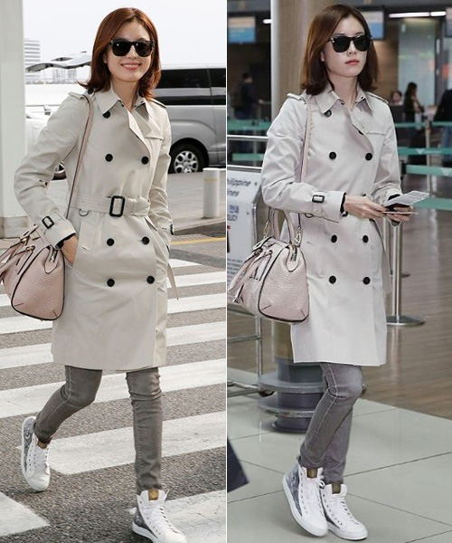 ♣역시나 클래식한 트렌치 코트지만 이번엔 화이트다. 이날 한효주는 스니커즈를 매치, 편안하면서도 스타일리시한 공항패션을 완성했다. 특히 사각 프레임의 독특한 토트백과 선글라스로 스타일에 포인트를 주었다.