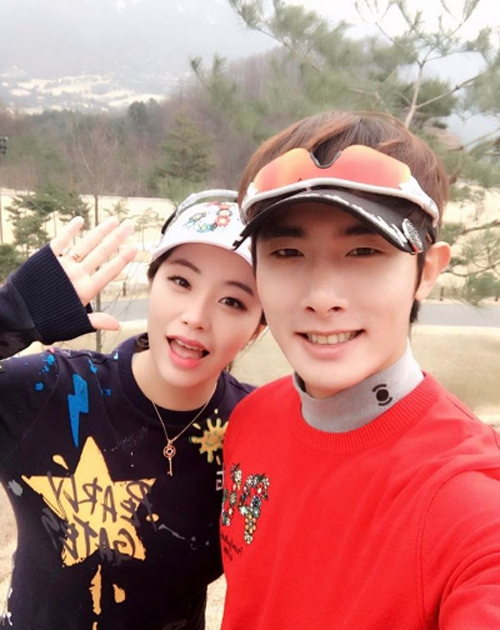 공개된 사진 속 두 사람은 골프장에서 다정하게 붙어서 카메라를 바라보고 있다. 양수진은 입을 크게 벌리고 깜찍한 표정을 발산해 러블리한 매력을 뽐냈다. 남편 이윤의는 상큼한 미소로 훈훈한 매력을 자아냈다.