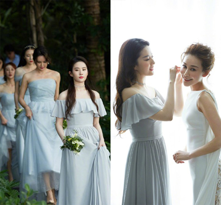 공개된 사진 속 유역비는 동료 배우들과 스카이 블루 컬러의 드레스를 맞춰 입고 꽃을 든 채 행진했다. 유역비는 오픈 숄더 드레스를 선택해 우아하고 단아한 매력을 발산했다. 또한 유역비는 신부에게 액세서리를 채워주며 우정을 과시하기도 했다.