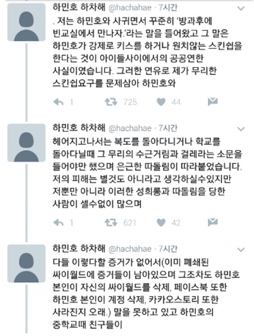 A 씨는 뒤늦게 하민호에 대해 폭로하는 이유에 대해서는 "연예계에 관심이 없으며 프로듀스101 관련 글이 리트윗이 되며 하민호가 해당 프로그램에 출연하고 있는 사실을 알게 됐다"며 "하민호 본인인지 확인하는 시간을 가졌고, 증명하기 위한 증거들을 찾아보느라 오랜 시간이 걸렸기 때문이다"고 덧붙였다.