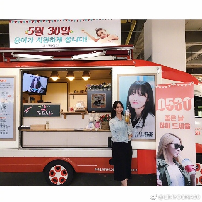 또한 윤아는 팬들이 선물한 푸드 트럭 앞에서 음료수를 들고 인증샷을 남겼다. 윤아는 작은 얼굴로 완벽한 비율을 뽐내 눈길을 끌었다.