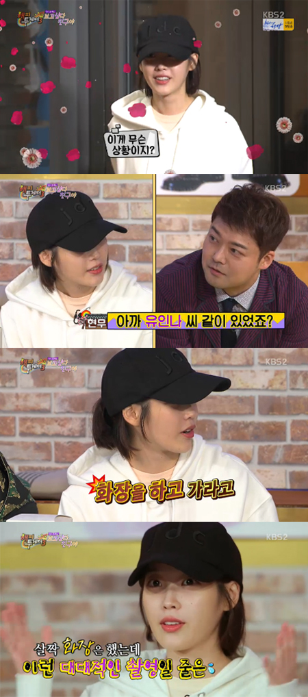 이날 아이유는 떡볶이를 먹고 싶다는 박명수의 전화를 받고 떡볶이를 사서 약속 장소에 찾아왔다. 아이유는 "유인나 씨와 같이 있었냐"는 전현무의 질문에 "맞다. 근데 언니가 화장을 하고 가라고 하더라"고 말했다.